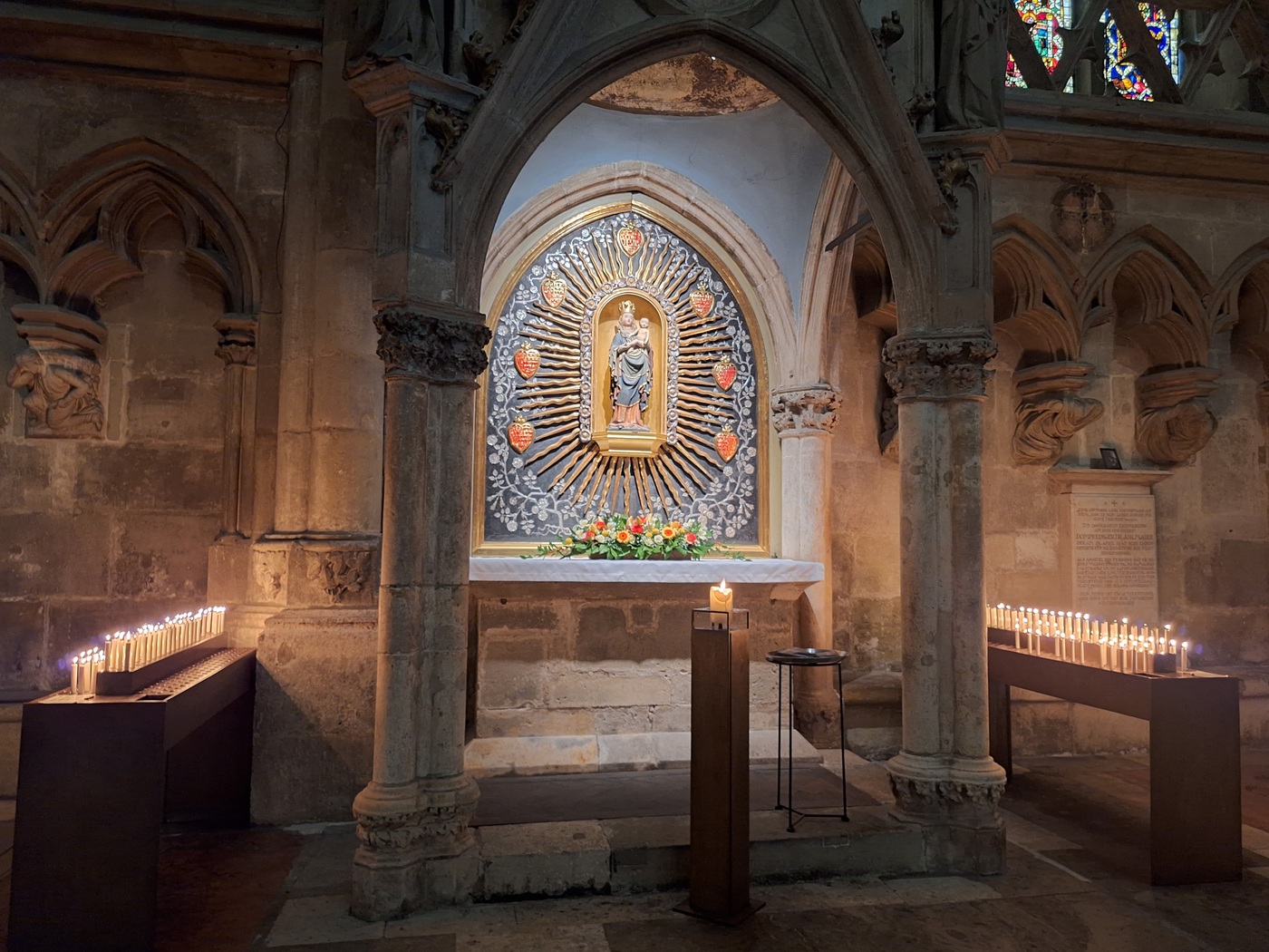 Inside, we were struck by the sheer height of the nave and the interplay of darkness and colour — the dim interior dramatically illuminated by vivid stained-glass windows. Key Gothic features, from rib vaulting and pointed arches to delicate stone tracery, all speak to centuries of craftsmanship. The cathedral’s spires now rise to about 105 metres, a defining symbol of Regensburg’s silhouette.