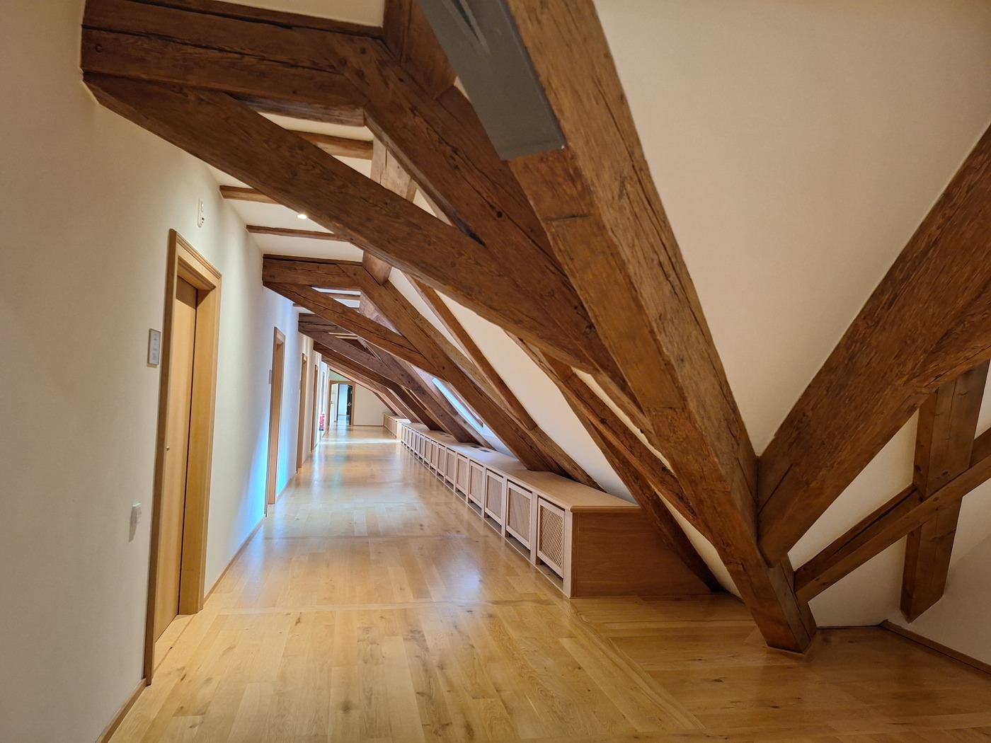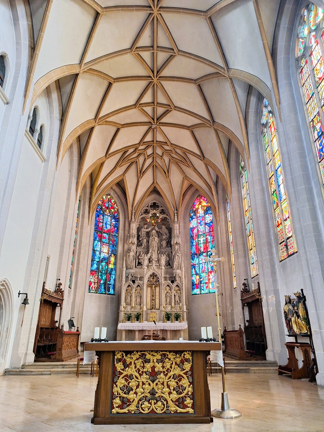 Inside, the warm wood created an inviting atmosphere. The roof structure, designed to echo Gothic rib vaulting, drew the eye upward, while the marble high altar depicting the Coronation of Mary stood out in refined splendour. Colourful stained-glass windows filled the space with light, their reflections softening the grey tones of the marble and adding to the church’s tranquil beauty.