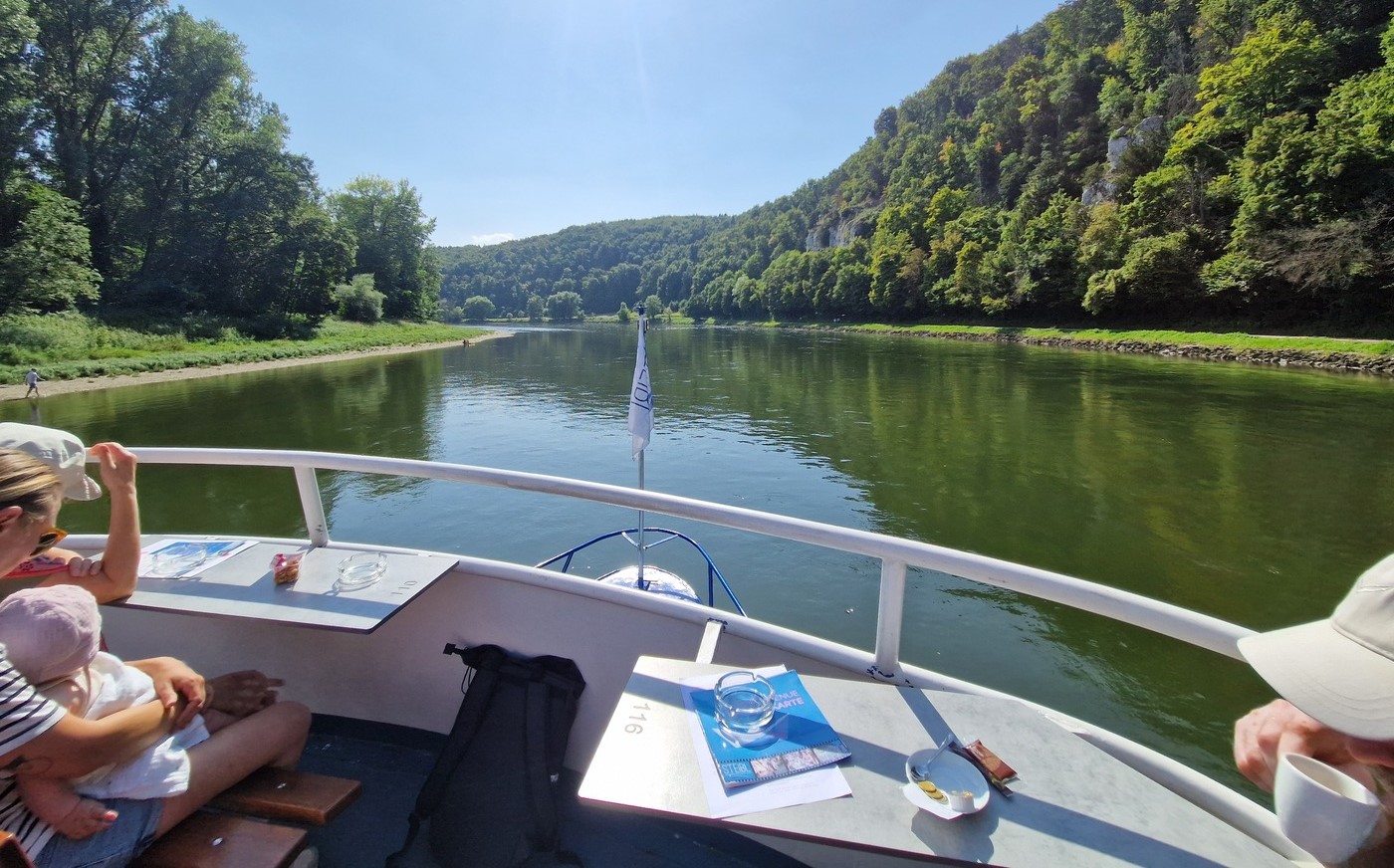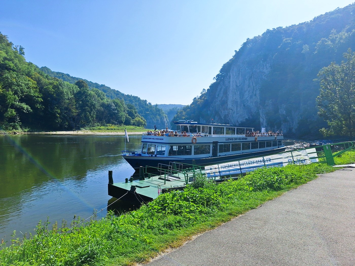 During our two-day stay at Weltenburg Abbey, we decided to take the opportunity to visit the nearby town of Kelheim. A river route connects the abbey with the town, and we boarded the double-deck boat Ludwig der Kelheimer, which departs from the landing stage just below the abbey.