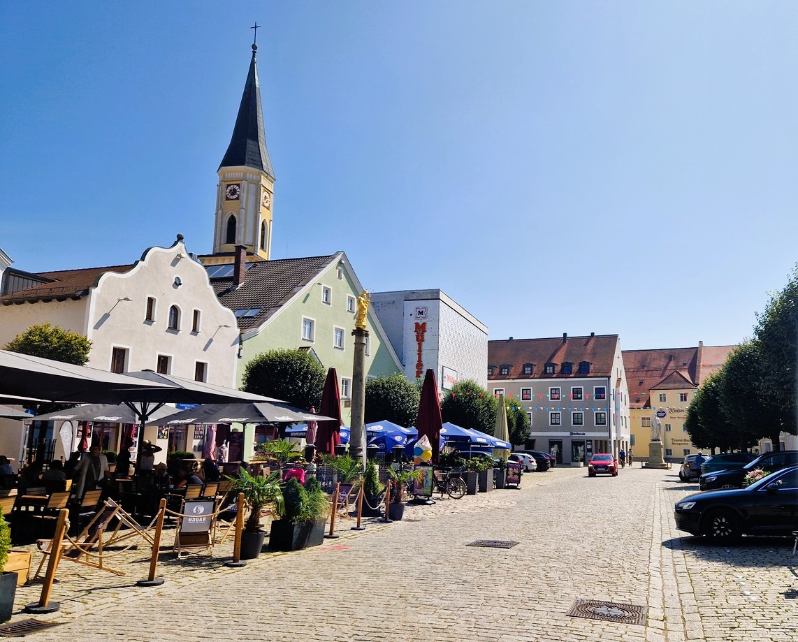 We found Kelheim to be a small town, yet full of its own treasures. We entered through the Mittertor (Middle Gate), part of the town’s original fortifications, its clock face and stone arch marking the entrance to the old centre. Beyond it stretched a broad street lined with pastel houses, shops, cafés, and restaurants, leading us to Ludwigsplatz, the main square. Here, the old town hall, the statue of King Ludwig I, and the Baroque column topped with a golden Madonna stand gracefully together, giving the square a balanced, understated beauty that perfectly reflects the town’s character. It’s no surprise that the square is listed as a protected architectural monument in Bavaria.