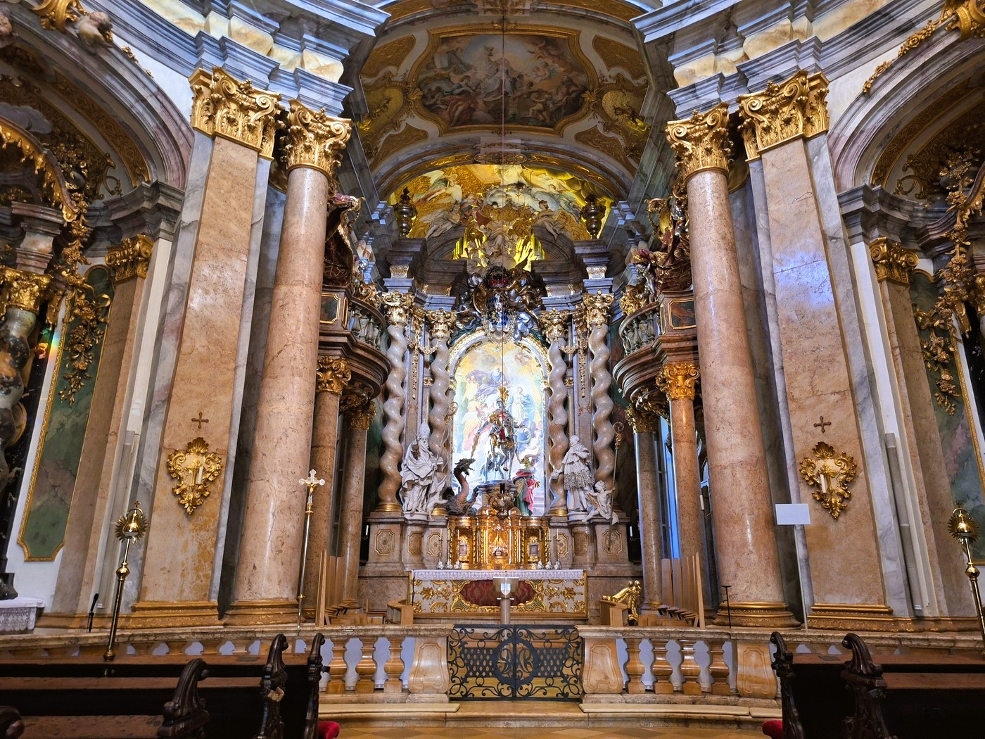 A vast oval fresco fills the ceiling with a magnificent scene of the Glorification of St George. The high altar erupting in gold and marble, show a sculptural group with St George on horseback, bursting forward from the altar frame, thrusting his spear into the dragon beneath him.